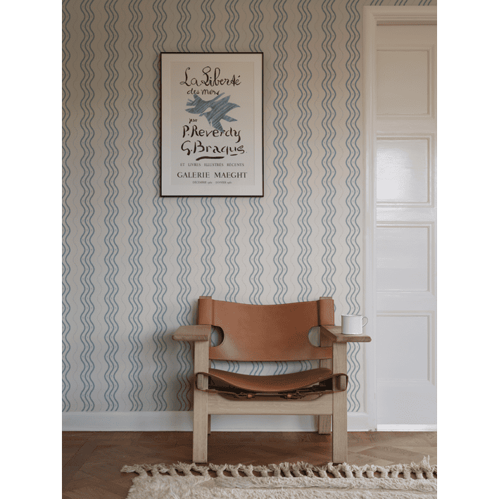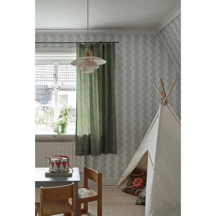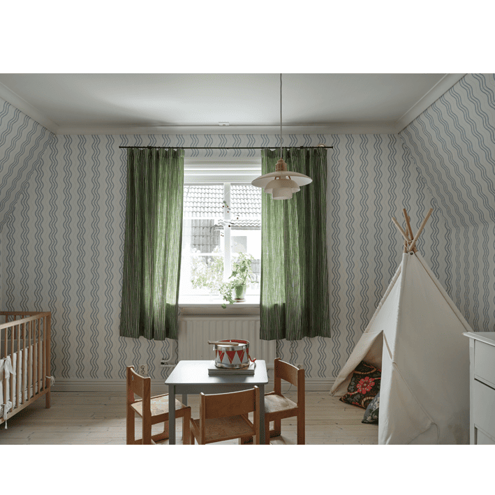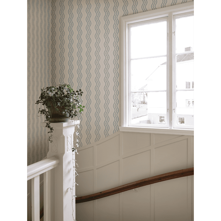 In collaboration with Johanna Bradford, we have developed this bold stripe that is both unique, has a slightly humorous tone, and looks very stylish on the wall. If you look closely, you will find the little crocus flower also featured in the pattern Betty. Ben, Light Blue, has soft light blue stripes and dots on an off-white background.