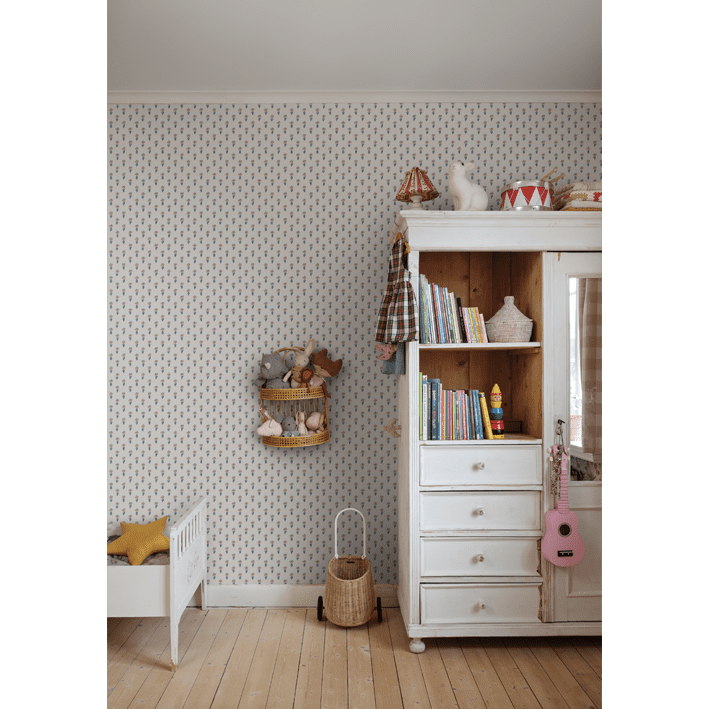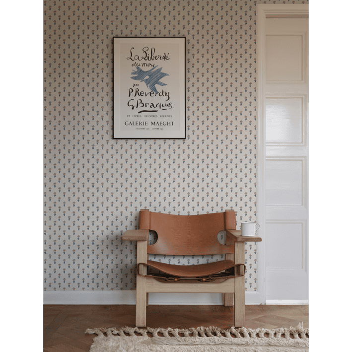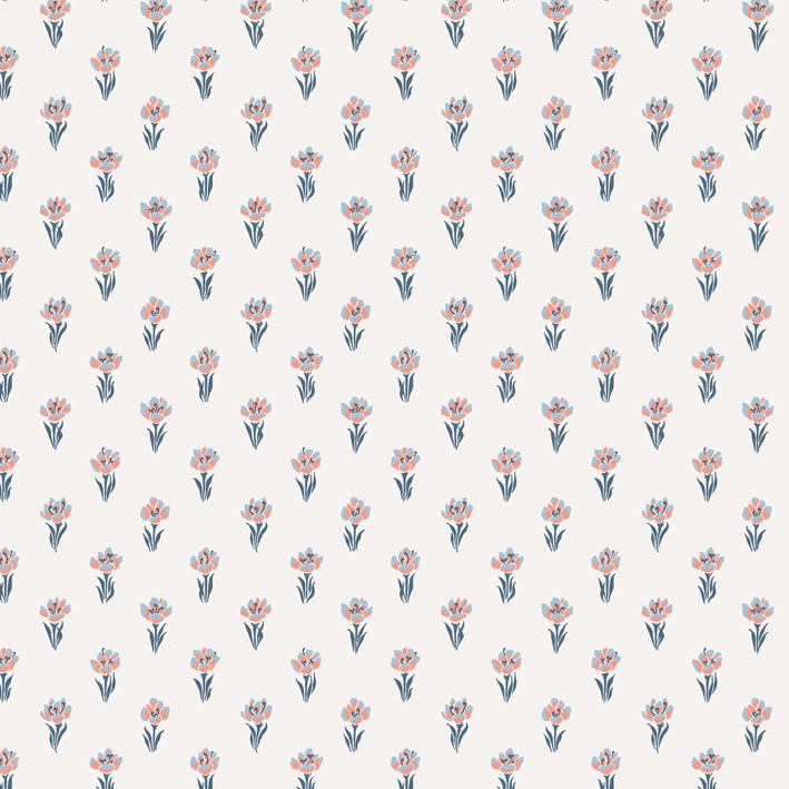 Eight tiny crocuses named "Timeless" are gathered in this decorative pattern, created in collaboration with Johanna Bradford. A detailed dotted pattern with a kind and cool international expression. The color scheme Blue has soft blue, and pink hues on an off-white background.