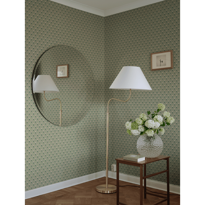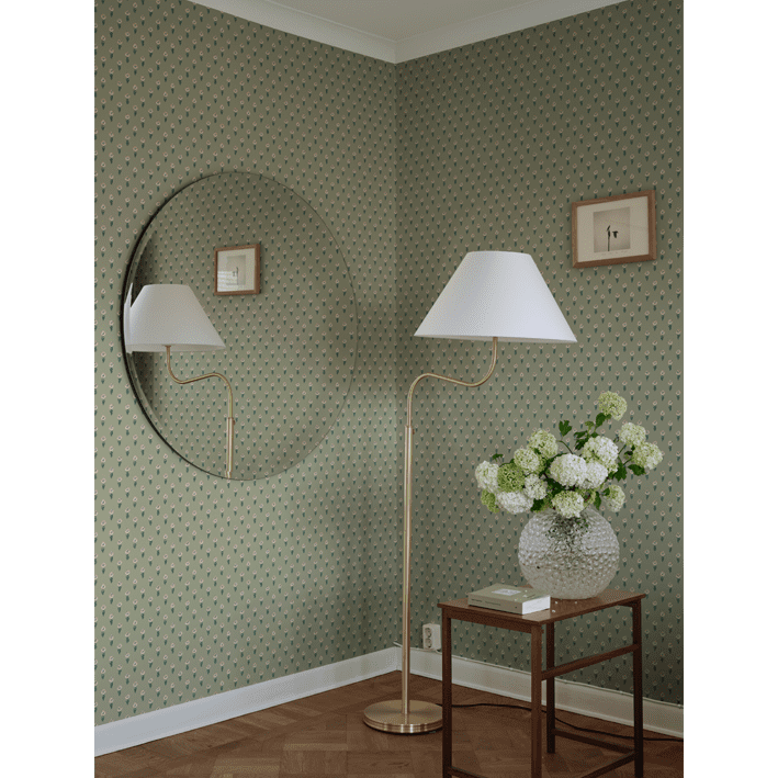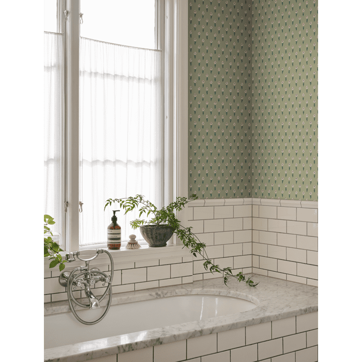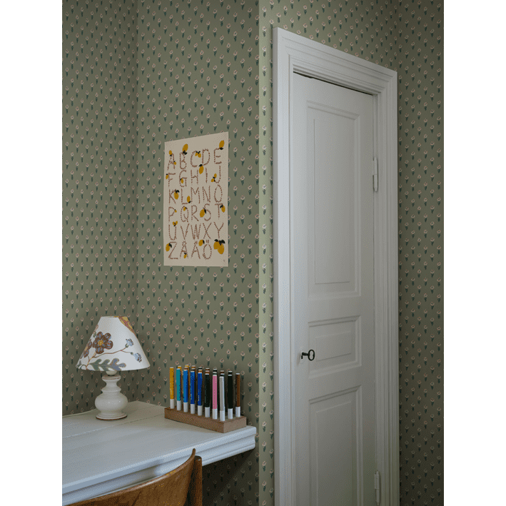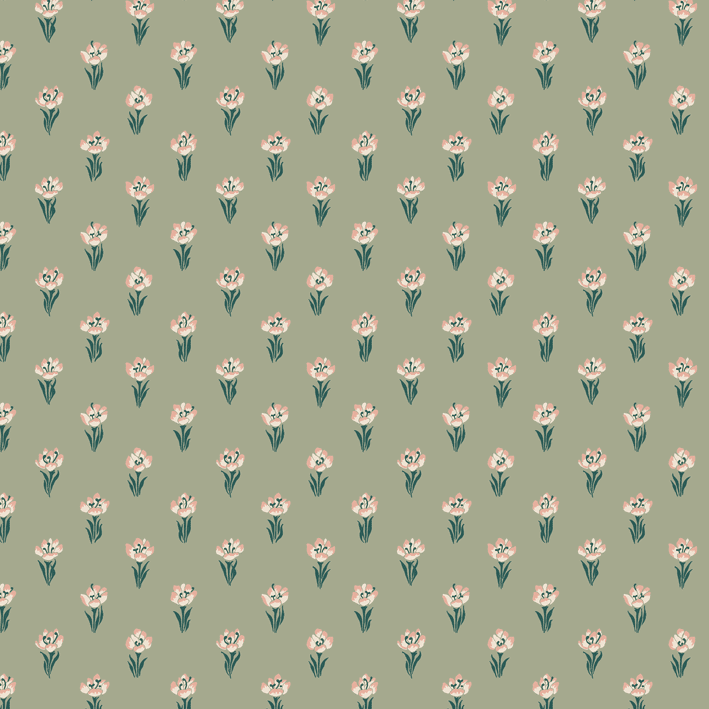 Eight tiny crocuses named "Timeless" are gathered in this decorative pattern, created in collaboration with Johanna Bradford. A detailed dotted pattern with a kind and cool international expression. The color scheme Green comes in pleasant shades of pink and green on a green background.
