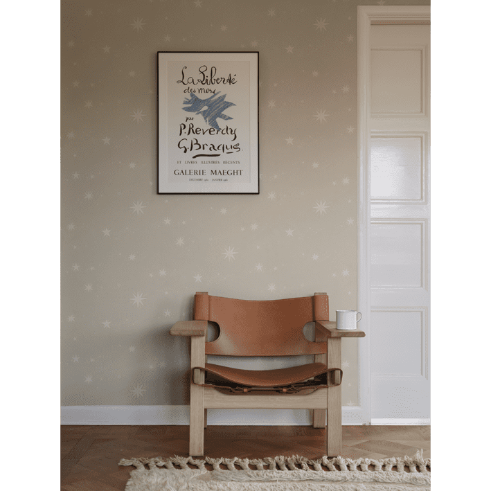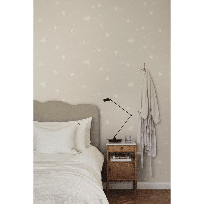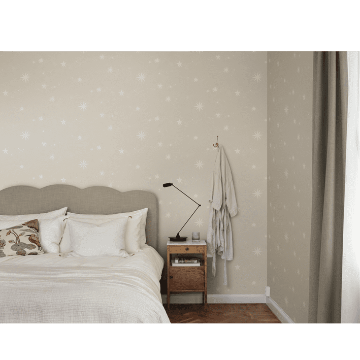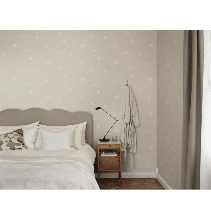 The beautiful hand-painted stars dance over the paper like stars in the sky. Created together with Johanna Bradford as a dreamy ceiling wallpaper, but it also works beautifully on the wall. The color scheme Sandstone comes in soft beige.