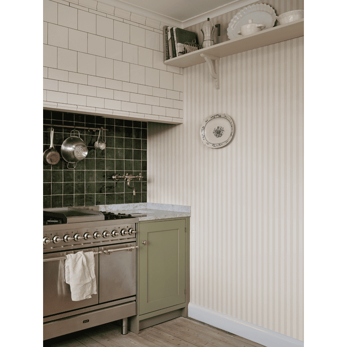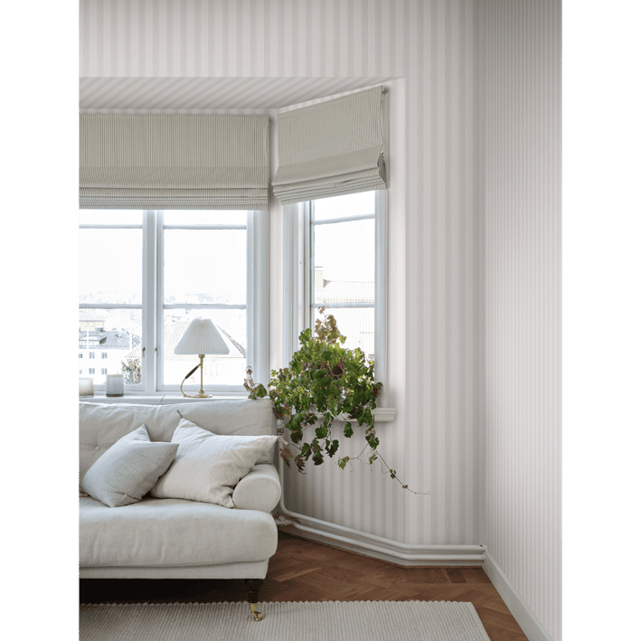 Our classic narrow stripe with small elegant gold dots is inspired by the beautiful silk draperies and furniture fabrics of the 18th century. Choose from classic colors that blend in with the room or one of the more colorful ones that give a distinct exclusive impression. Gustav, Light Gray, comes in lovely soft gray hues.