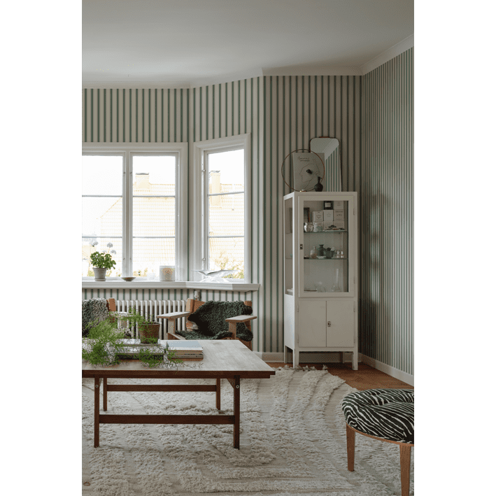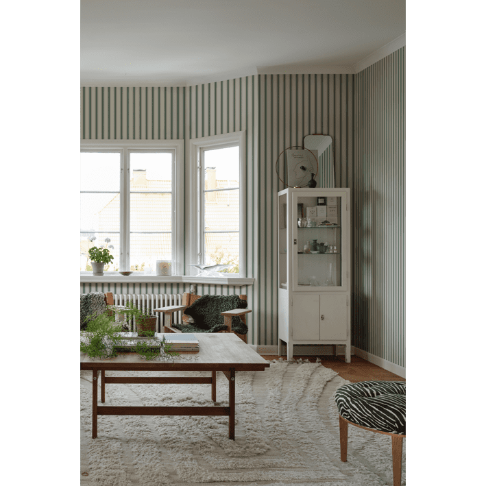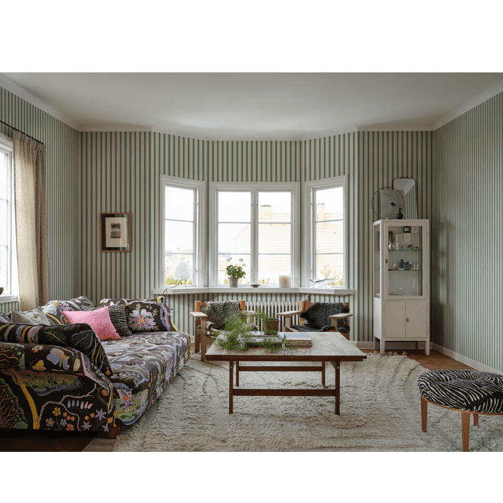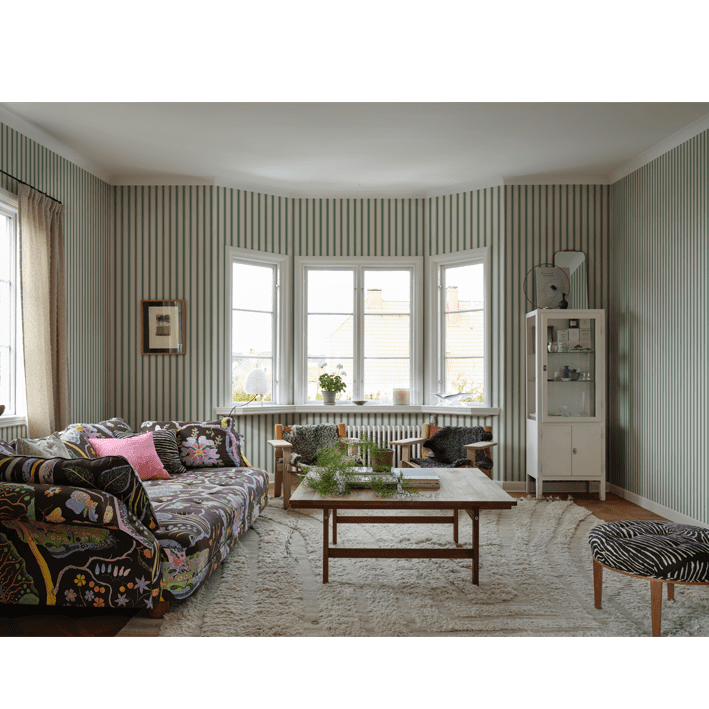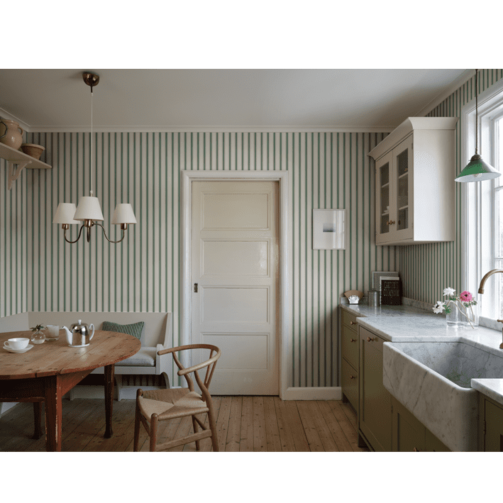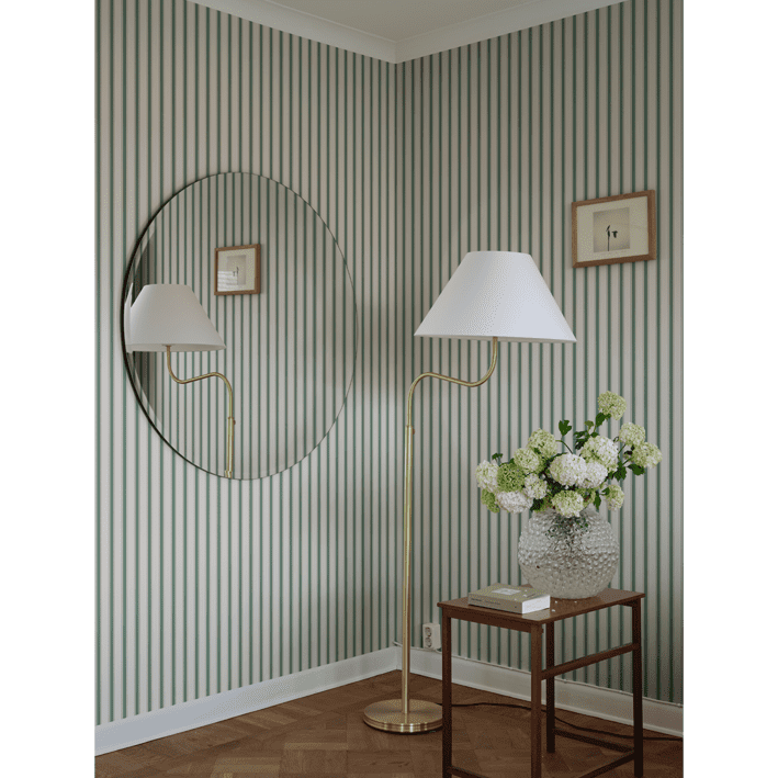 Our classic narrow stripe with small elegant gold dots is inspired by the beautiful silk draperies and furniture fabrics of the 18th century. Choose from classic colors that blend in with the room or one of the more colorful ones that give a distinct exclusive impression. Gustav, Green, is a colorway in a dashingly beautiful bright green.