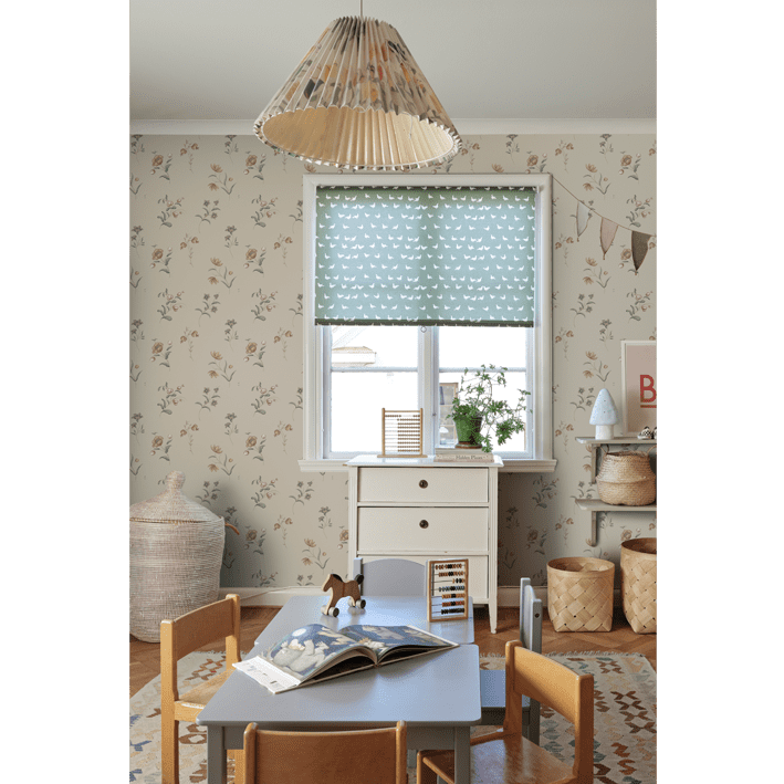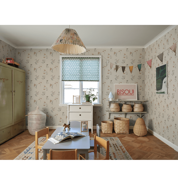 A patterned design slightly flirting with Swedish folk art and decorative painting from the 18th century. The bold brushstrokes and harmonious color scheme create an authentic feeling of hand-painted flowers on the wall. Hanna, Sandstone, comes in soft pastels on a beige sandstone background.