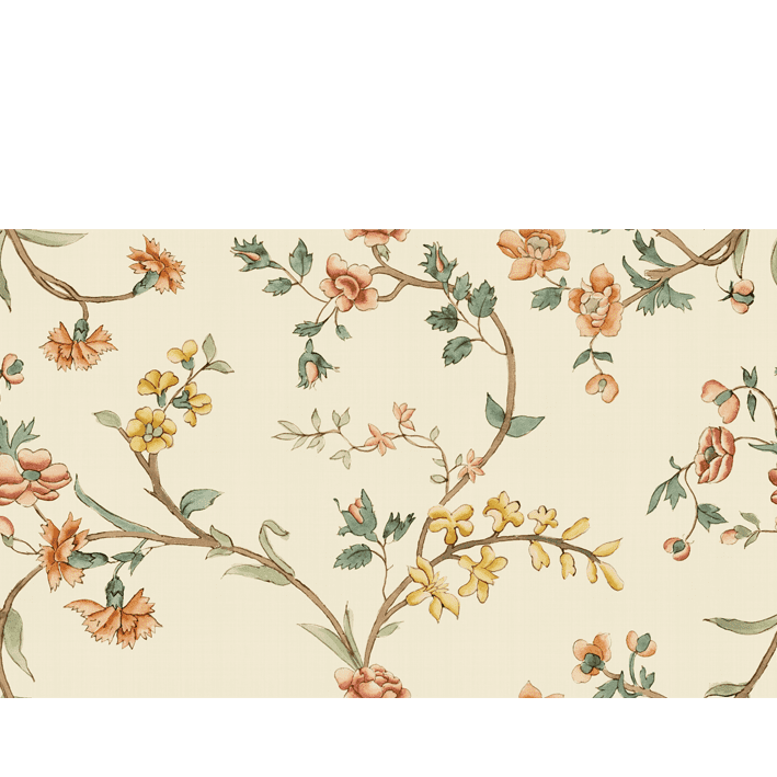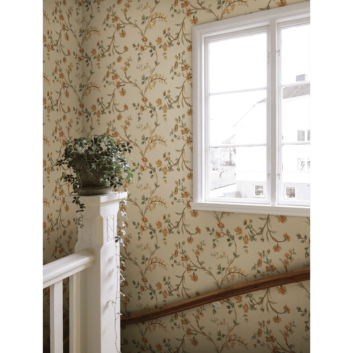 A romantic floral pattern from the 19th century with a pleasing hand-painted expression in harmonious colors. Soft in its appearance and with a vintage feel. Clara, Oat, has flowers in lovely yellows, soft reds, and green leaves on a warm beige background.
