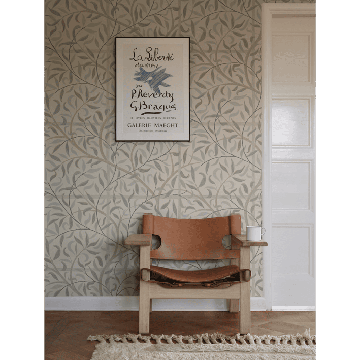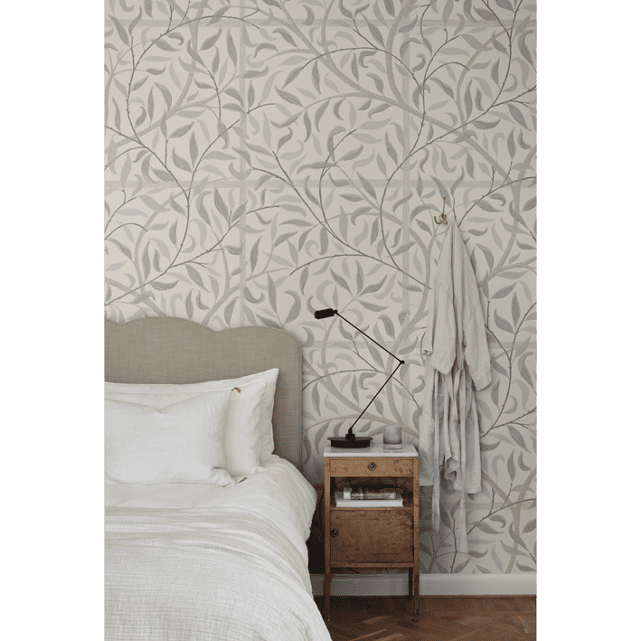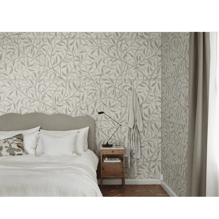 Emmie is an enlarged version of our popular pattern Diana found in our archives. It's a lovely trellis that embraces the room and makes it lush year-round. Emmie, Sandstone, is a softer color scheme in muffled shades of green on a beige background.