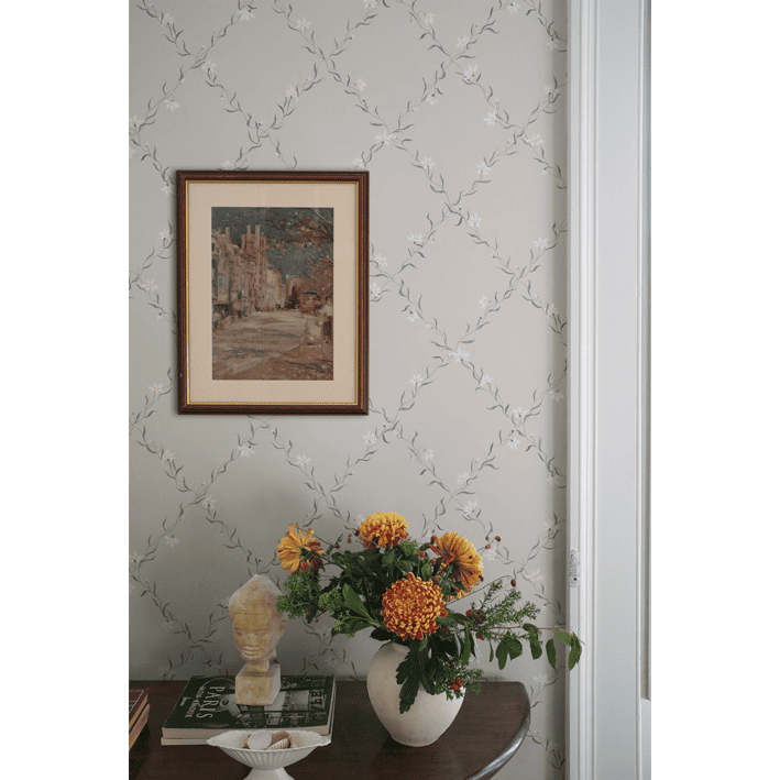 Ewa grey is a wallpaper with gracefully handpainted cornflower garlands. The cornflower was a favourite cut flower in the Gustavian era. The feature of the pattern reminds us of the white and blue Chinese porcelain from the East India Company