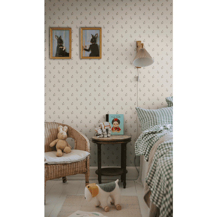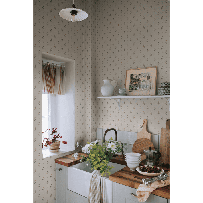 In the wallpaper Siv, we took a closer look at the berries on the hawthorn trees. The small clusters create a friendly, decorative impression, beautifully matching more patterned designs. The lovely little berries come in a warm, muted yellow on a beige base in the color scheme Oat.