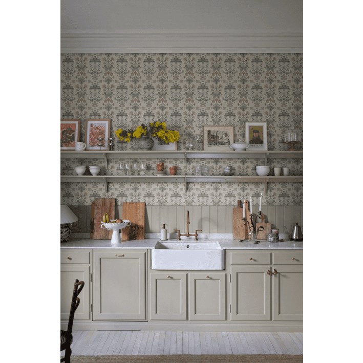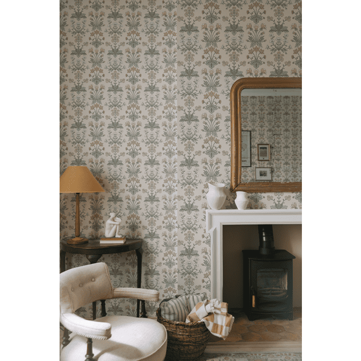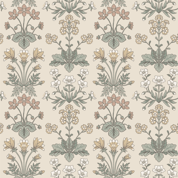 The lovely little bulbous plants that grow wild in Öland's habitat are the first signs of spring and the arrival of warmth. This rare medallion wallpaper includes Bluebell, Wood Anemone, Cowslip, and Sun Rose. The color scheme, Clay, comes with a clay-colored base, green leaves, and cute flowers in blue, yellow, and white.