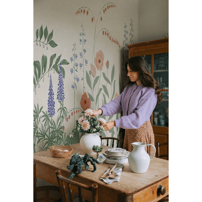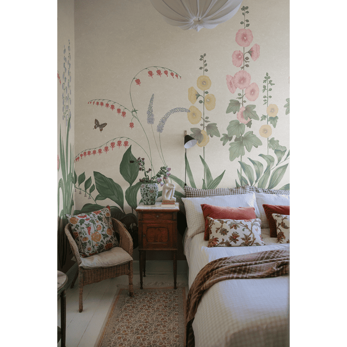 Along the roadsides of Öland's older village streets, one is often met by this grand wildflower silhouette. Hollyhocks, Bleeding Heart, and Peony Poppy come together in a colorful symphony. The color scheme, Colorful, comes in lovely summery shades: beige, green, yellow, pink, blue, purple, and red.