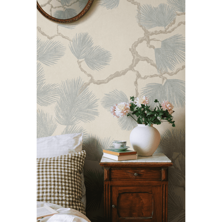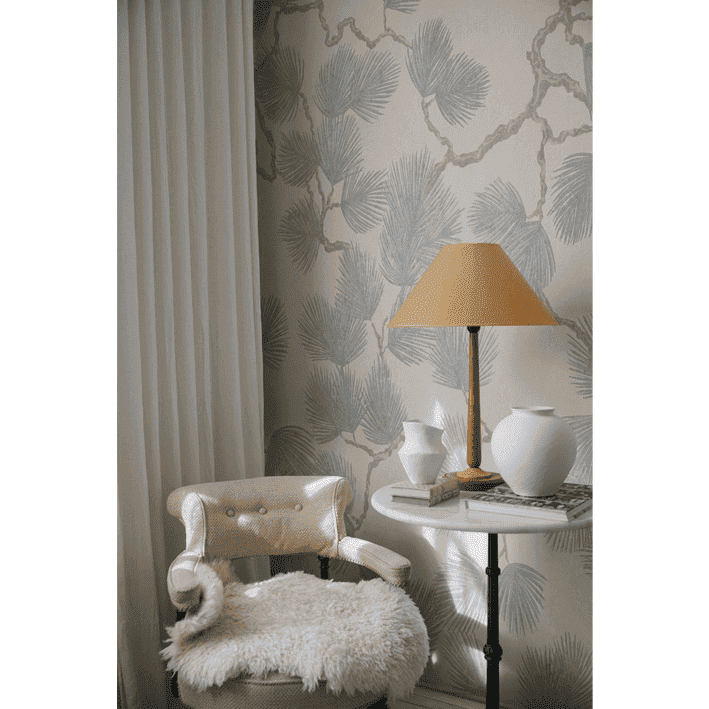 Windblown pines stand proudly in groups near the coastal meadows of Öland. Pine Mural is an enlarged version of our beloved pattern Pine, where the branches with feathery needles cover the wall in a light, airy dance. Lively yet serene. Pine Mural, Green, has a warm gray base with brown branches and lush green needles.