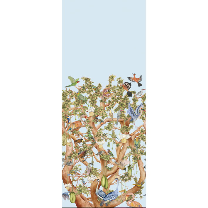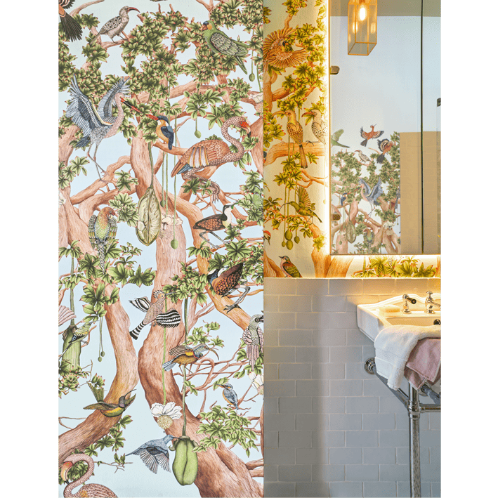 Artists from both design houses hand-painted the ornamented fauna within this expansive tableau; the distinctive Cole & Son hand blending seamlessly alongside Ardmore’s characteristic style.