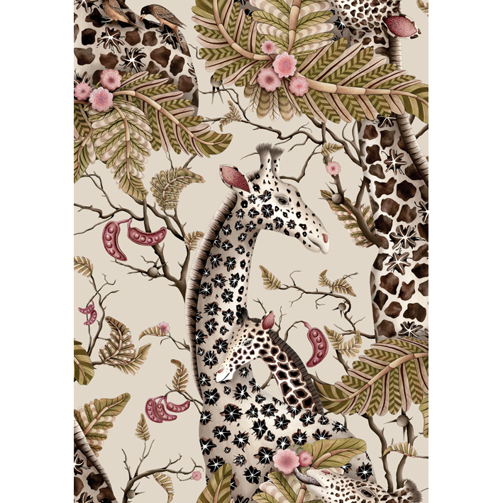 Each giraffe is embellished with incredible hand-painted details, each proudly displaying their markings. A monochromatic colourway of Pebble provides a gentle softness to the design, whilst Stone & Mulberry and Safari offer quintessential Cole & Son exceptional colour. This design is also available in a truly Royal Gilded palette that gives the scene a golden hour glow, with a subtly textured base allowing for the light to enhance each detail.