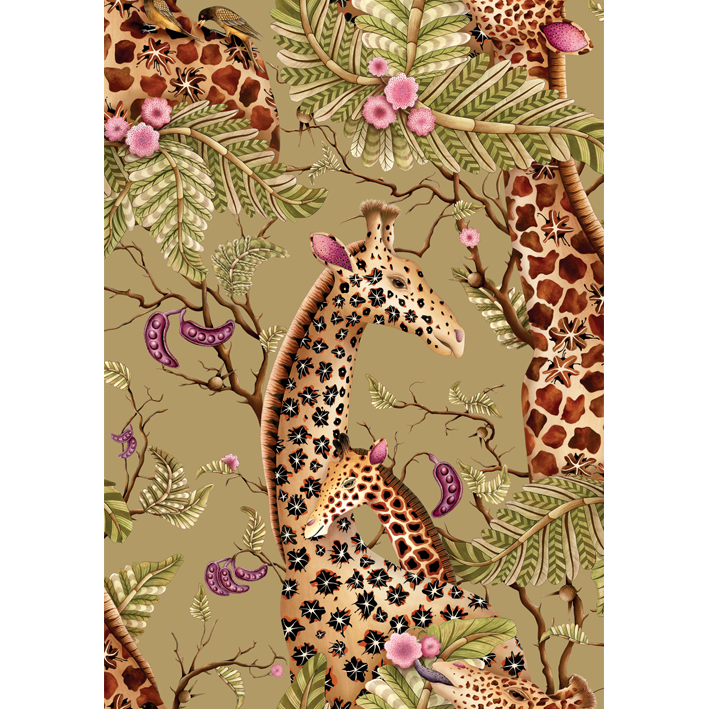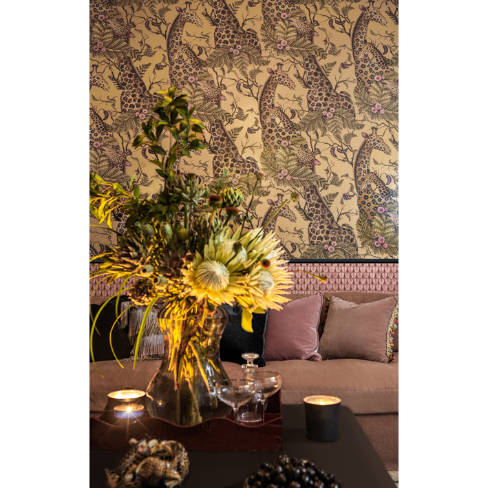 Each giraffe is embellished with incredible hand-painted details, each proudly displaying their markings. A monochromatic colourway of Pebble provides a gentle softness to the design, whilst Stone & Mulberry and Safari offer quintessential Cole & Son exceptional colour. This design is also available in a truly Royal Gilded palette that gives the scene a golden hour glow, with a subtly textured base allowing for the light to enhance each detail.