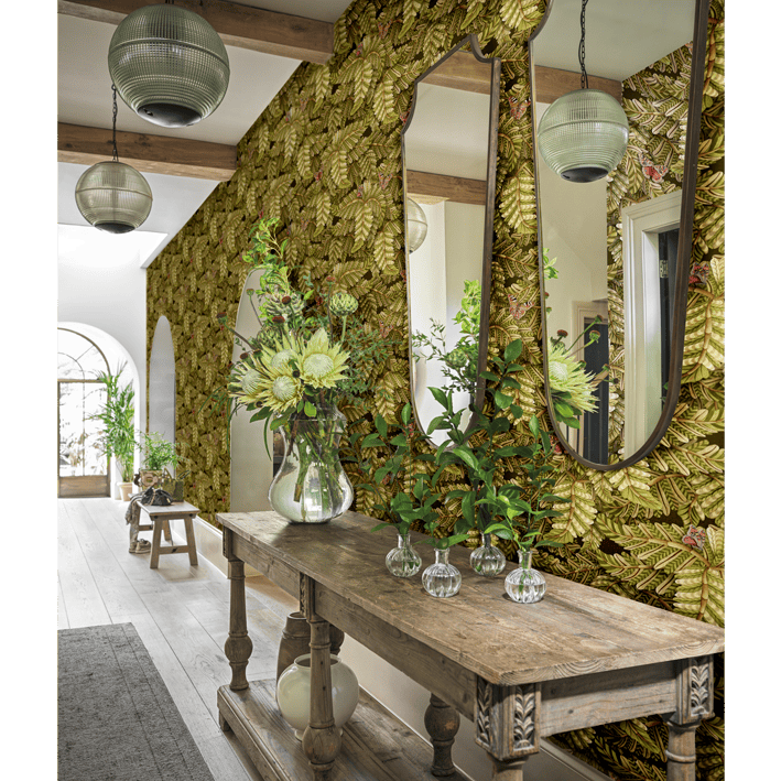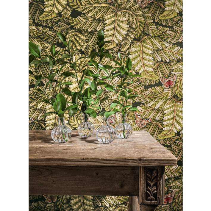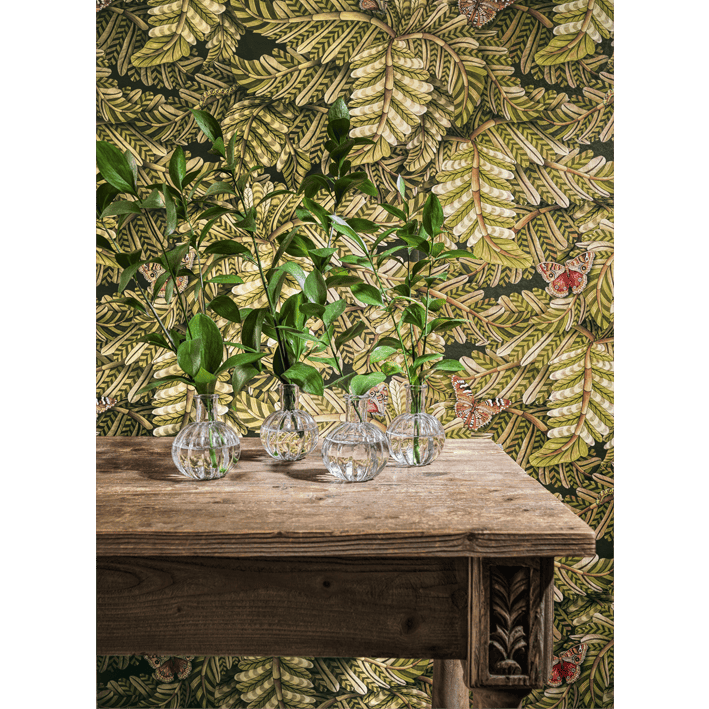 Painted in the distinctive, intricately patterned style of Ardmore ceramics, Acacia Canopy’s dense leaf coverage invites the eye to wander within. A closer look reveals resplendent butterflies fluttering proudly from leaf to leaf. Resilient and strong, the acacia stands throughout the seasons in leafy tones of Safari, arid Pebble, and dusk Plums.