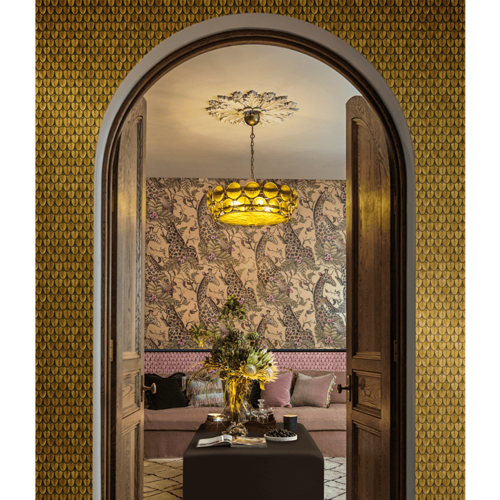 Sharing its name with the beautiful Narina Trogan Bird native to KwaZulu-Natal, Narina is derived from the detailed patterning found on many Ardmore bowls and vases. Cole & Son artists have created a soft watercoloured geometric design using the stylised feathers of the Narina Bird to produce a subtle yet unusual semi-plain wallpaper.