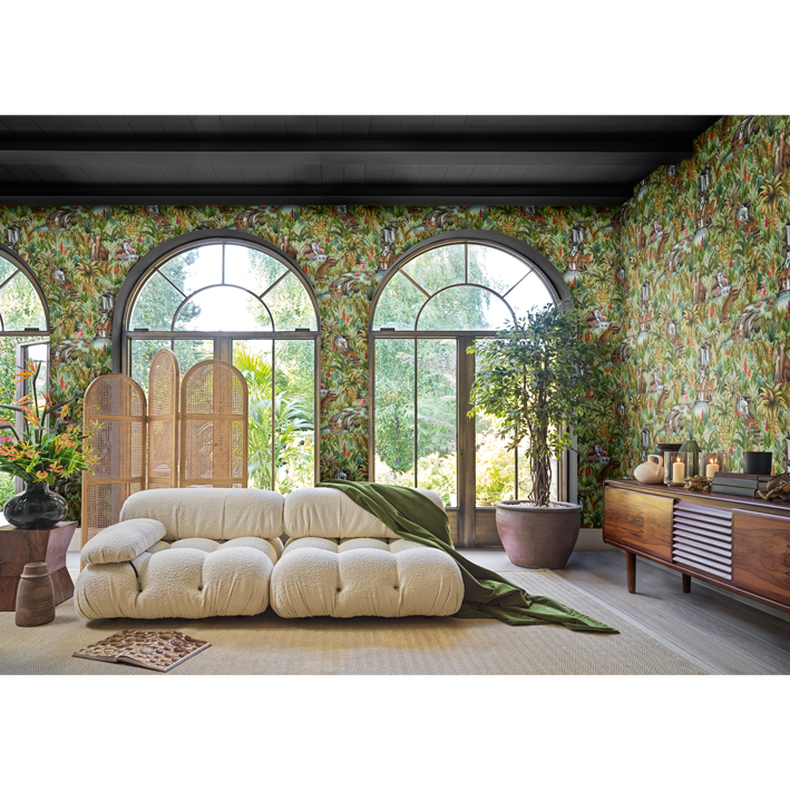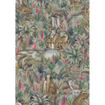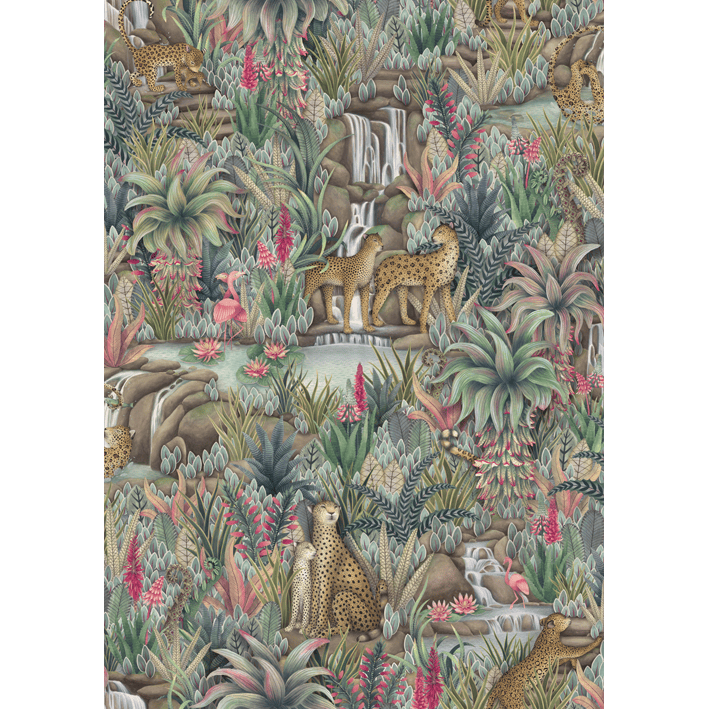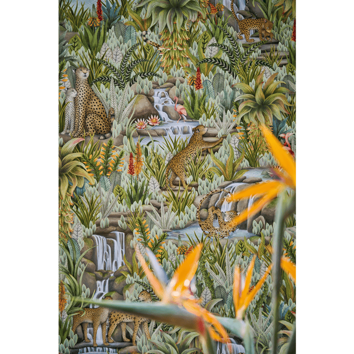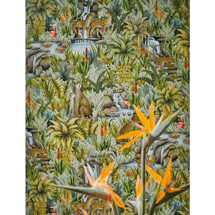 This lush display contains numerous animals, including big cats, flamingos, and fish, with more unfolding the further you look. Injisuthi’s three colour palettes are representative of this changing botanical landscape with the verdant Jade showing the scene in full abundance; Viridian turning the scene from day to dusk; and Stone & Sand showing that even when the seasons become arid and plant-life becomes parched, life continues and rejuvenation is waiting just around the corner.