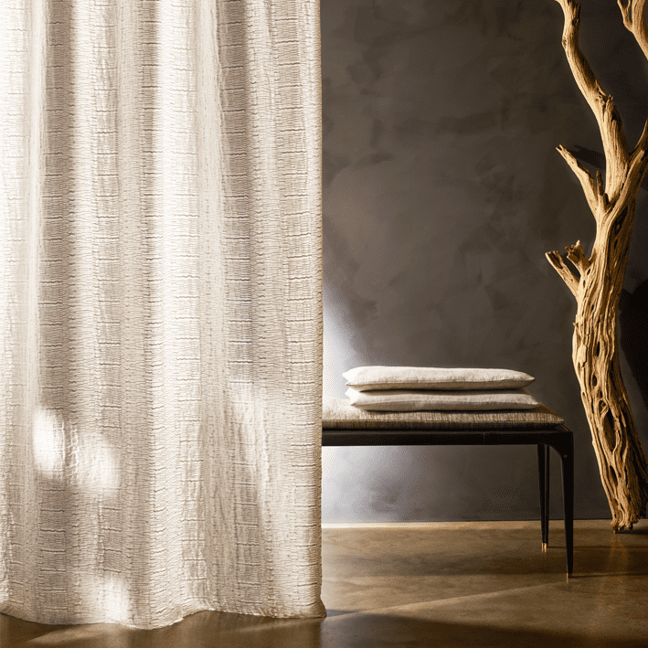 This double width sheer is exquisitely crafted using an ultra-fine linen warp interwoven with wool yarns that meander across the surface to create a fabric reminiscent of delicate root structures. Specialist finishing gives this fabric natural irregularities and character that create delicate shadows as light passes through. Perfect for lightweight and sheer curtains and blinds.