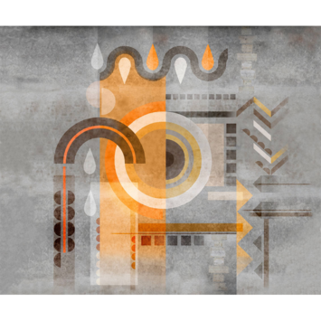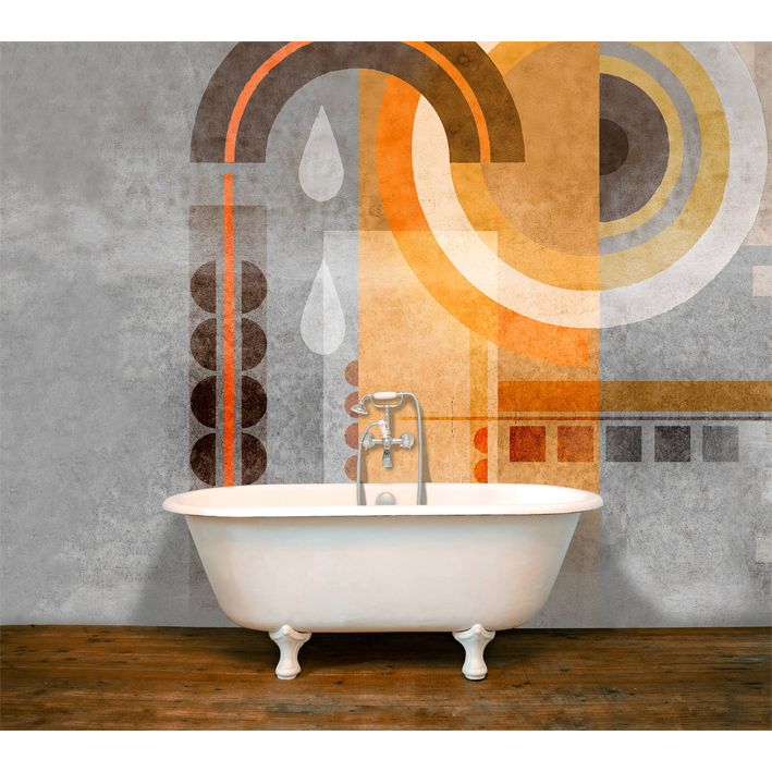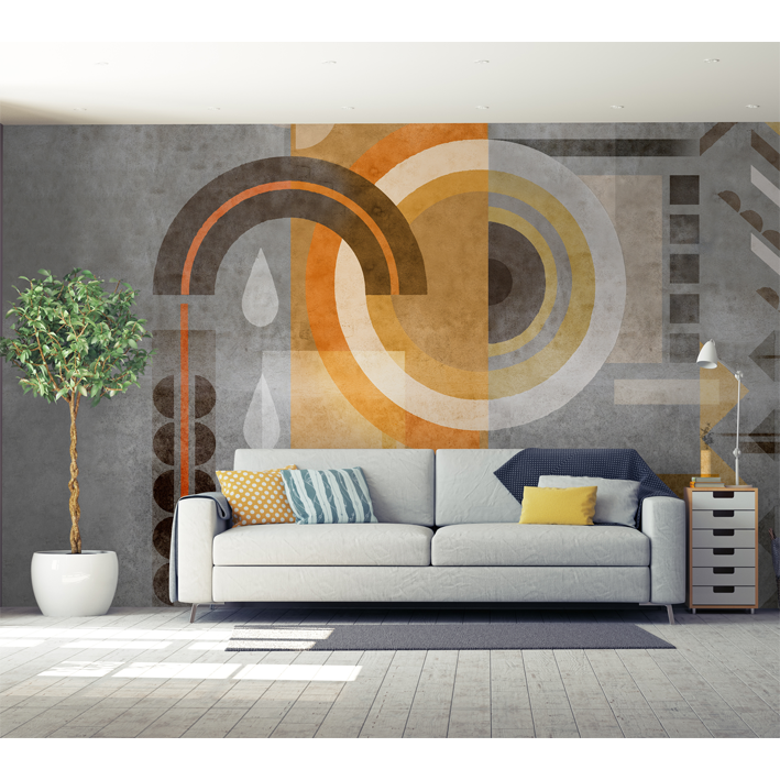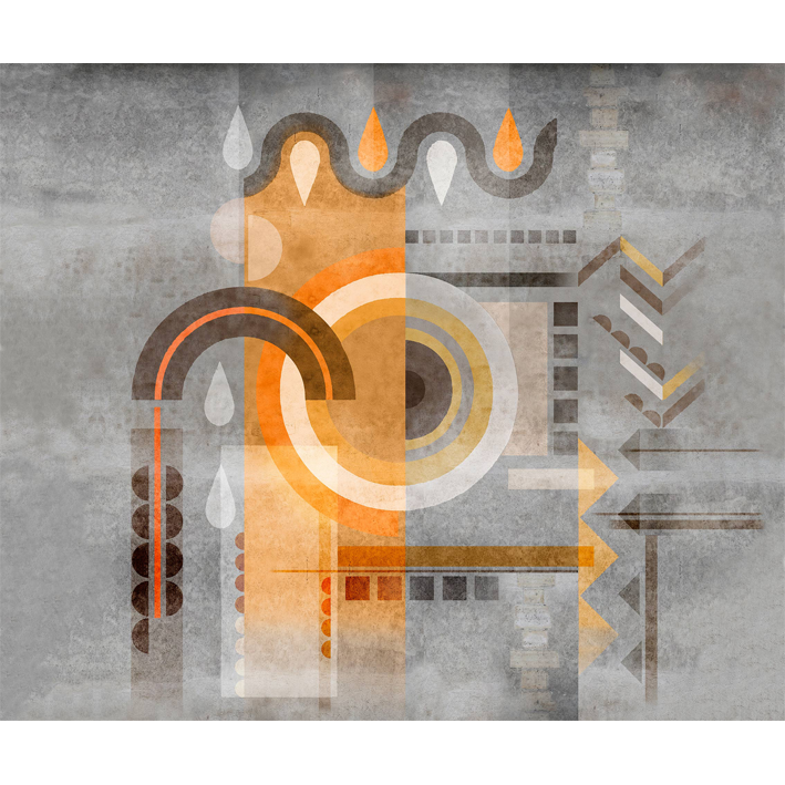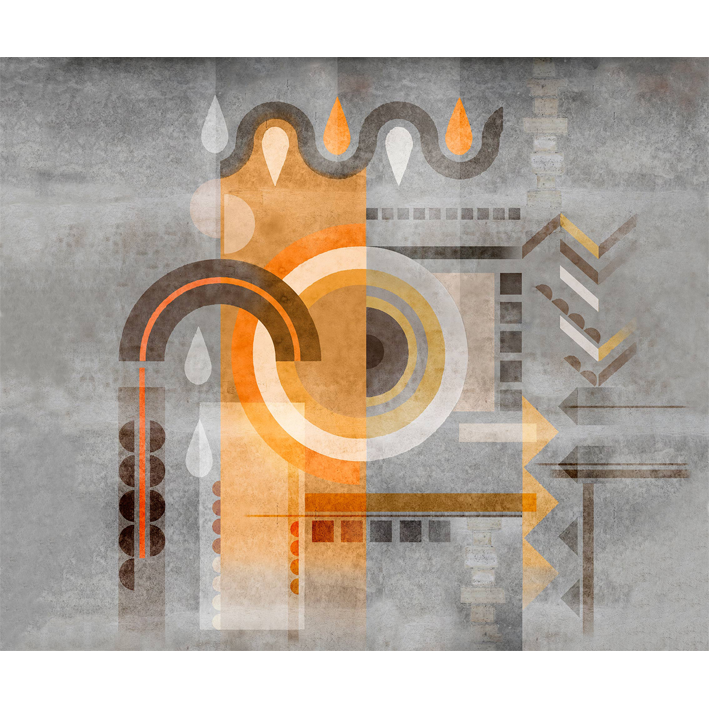 On a mouse-grey concrete and cement wall, mysterious geometric signs were painted. Tinged with golden yellow, orange, brown, anthracite, pearl grey, cream, these shapes probably mean "Be at peace in a world of balance. ». A panoramic wallpaper that will incite meditation!