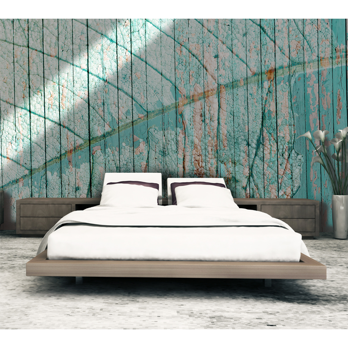 A giant fossilized hydrangea leaf print, inlaid in a wall of celadon blue cracked wood planks. The softness of the tones and the power of the image give a great personality to this new generation panoramic wallpaper
